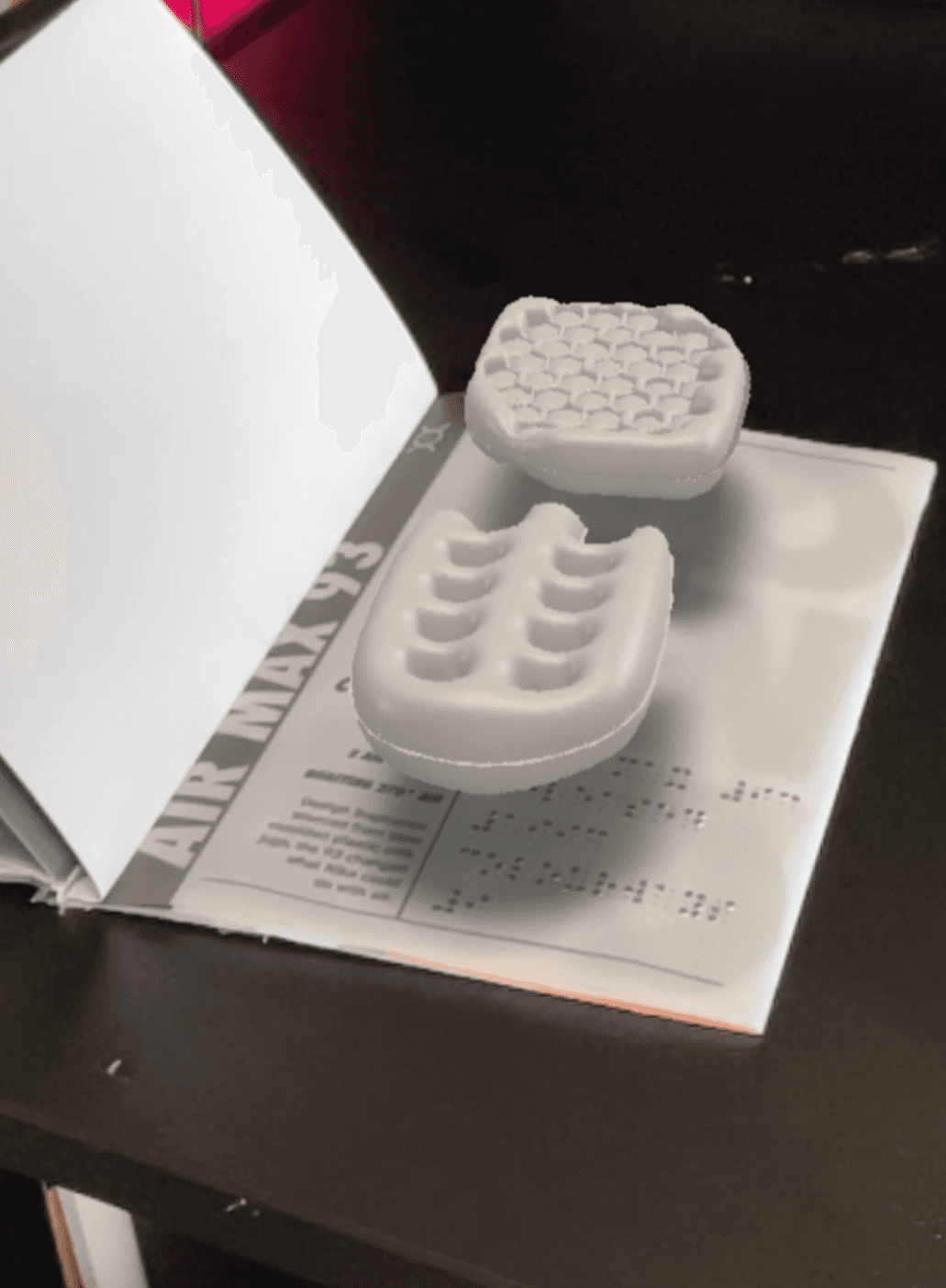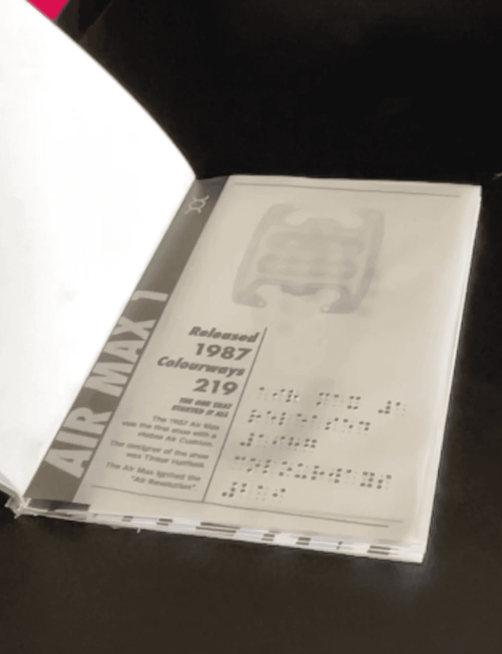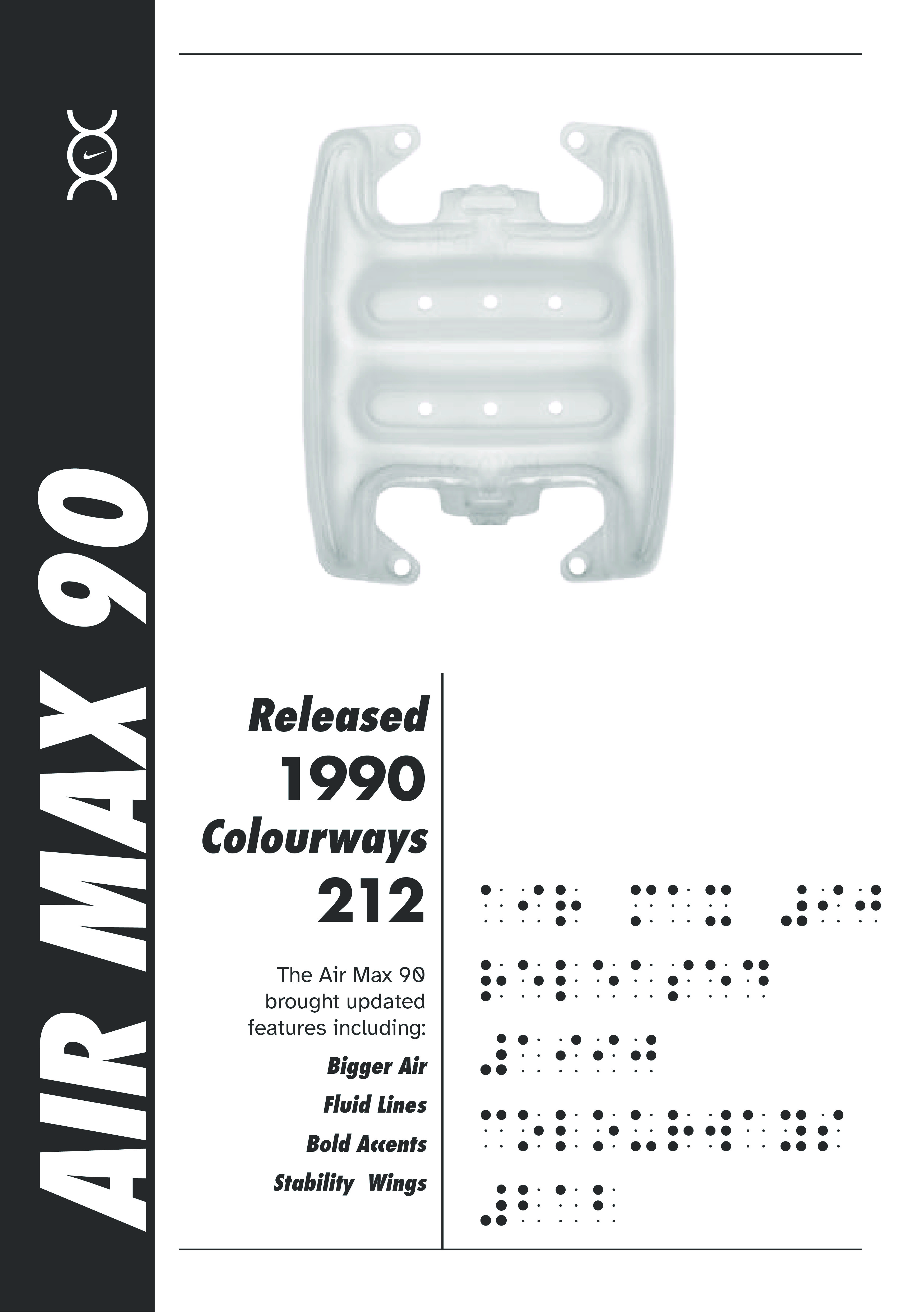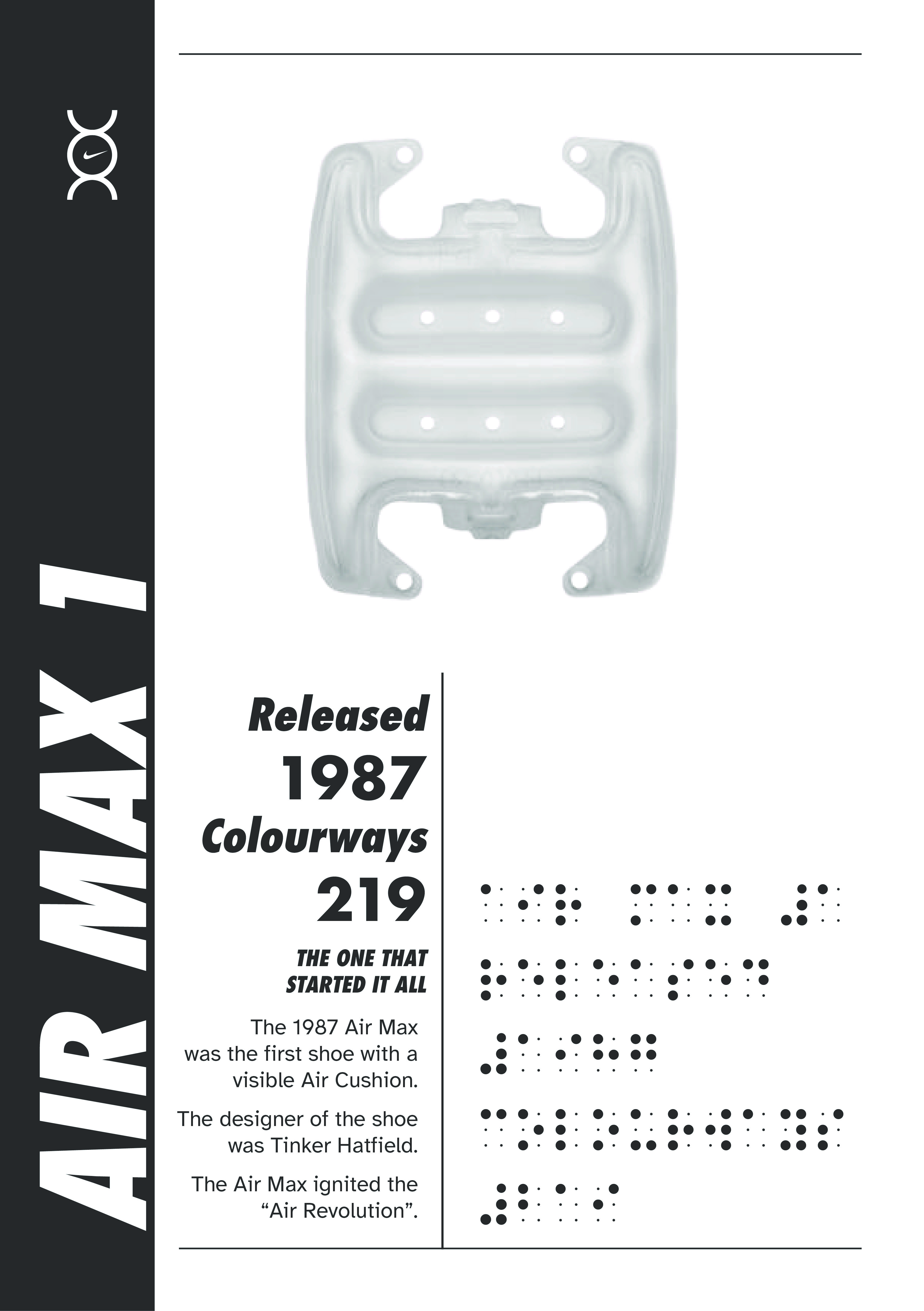 Encompass the archive in a print publication, incorporating tactile mediums through embossed braille and debossed shoe prints for visually impaired audiences. Utilising augmented reality to display the hidden inner air cushion and the silhouette of the AirMax model/ collaboration, and colour way.