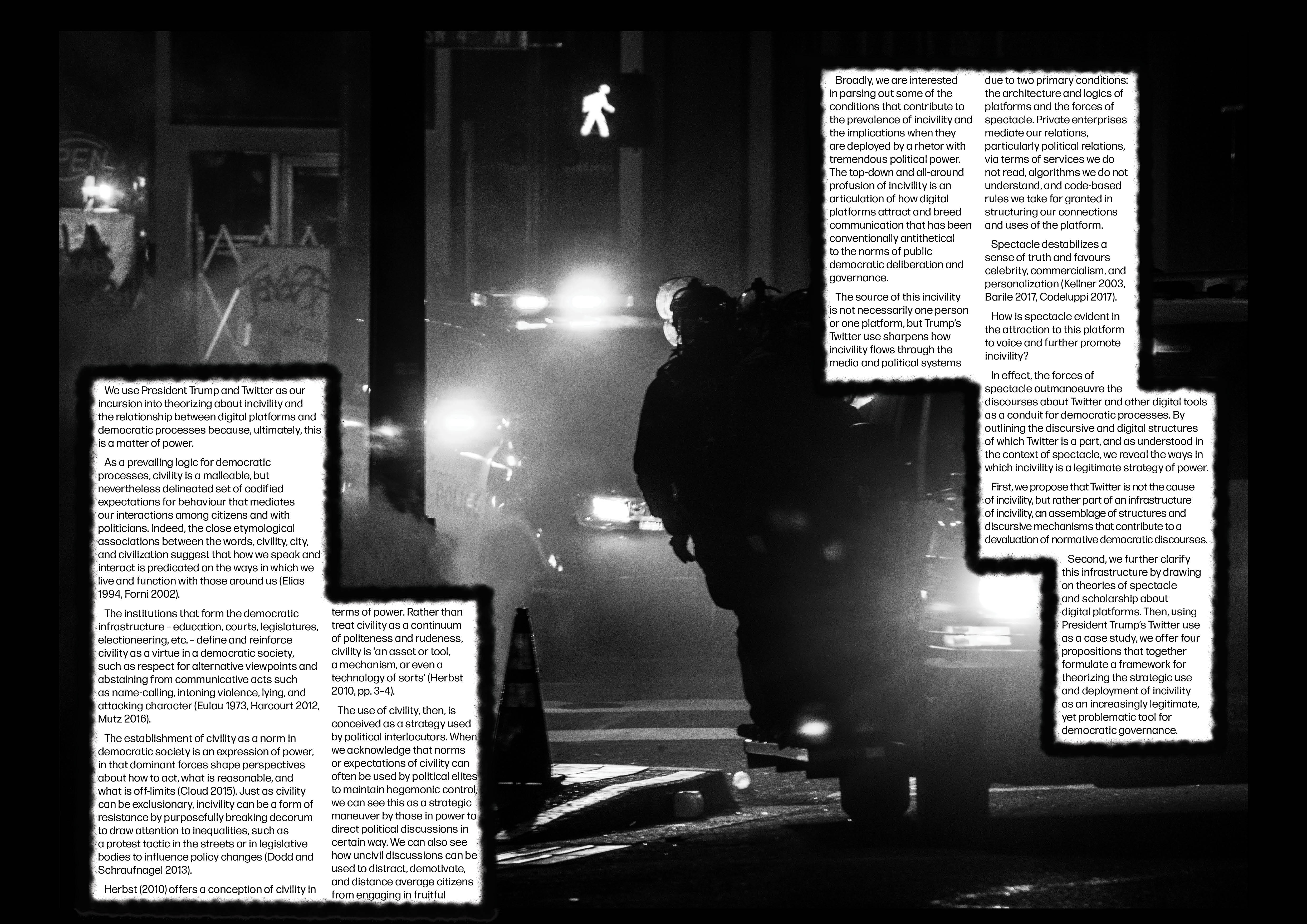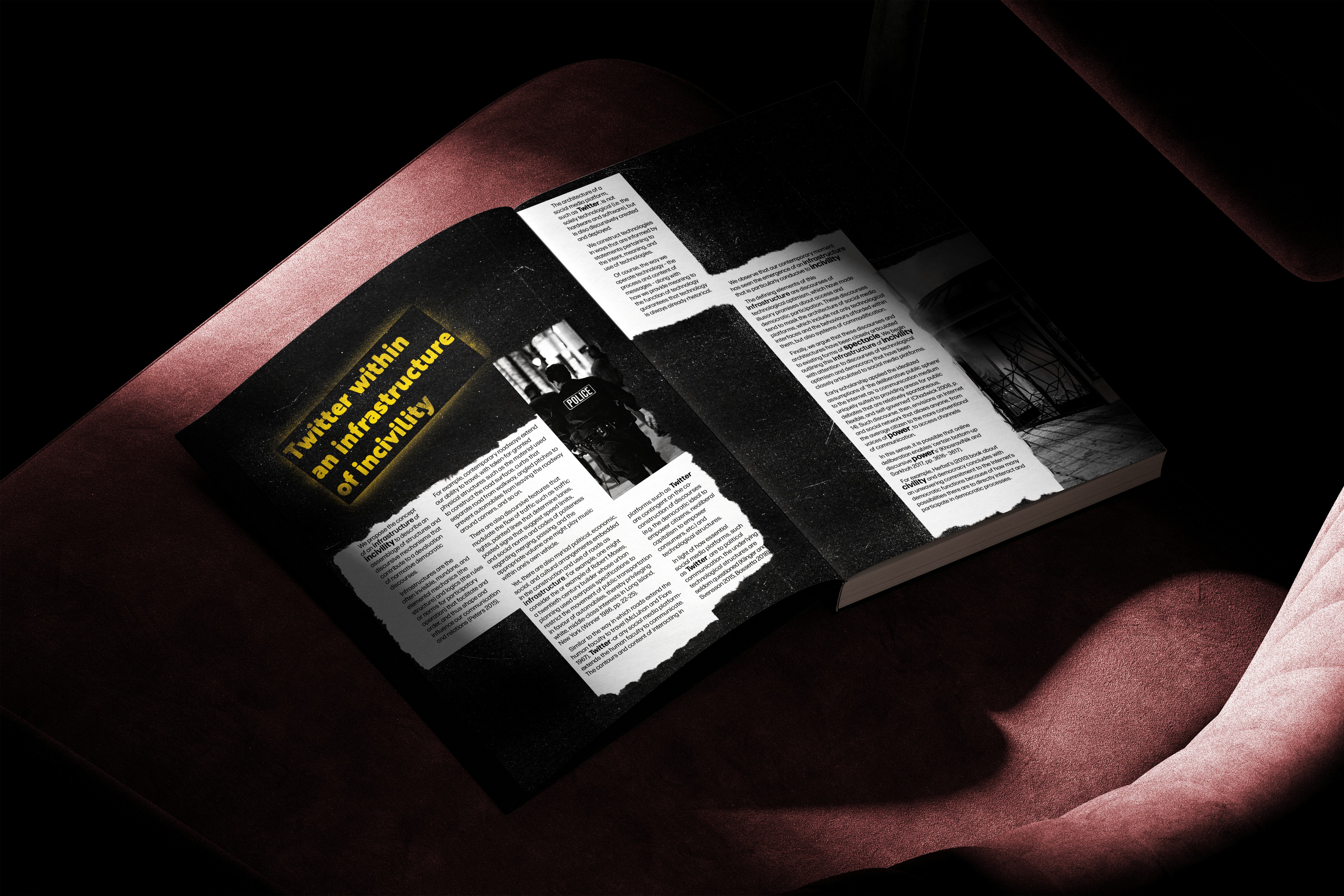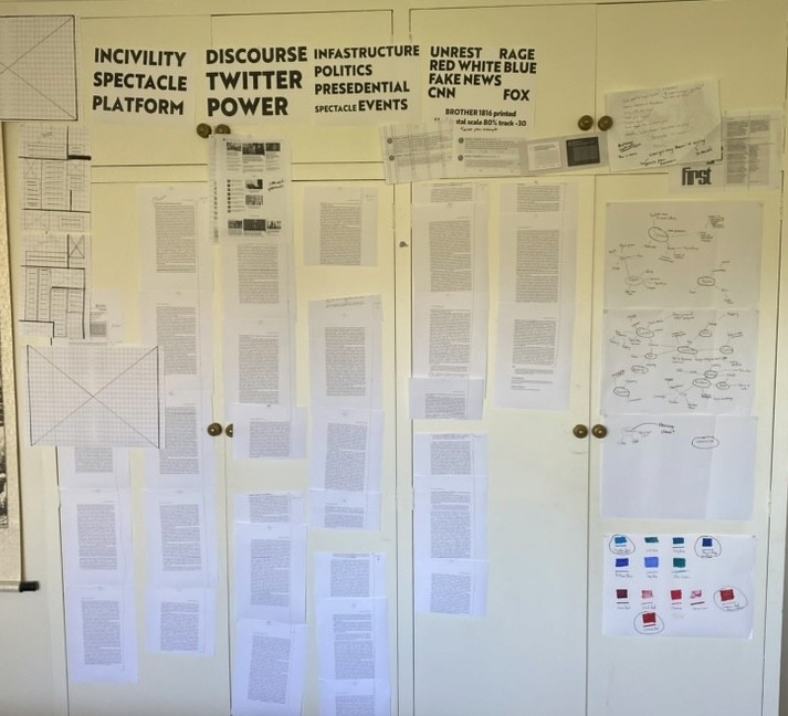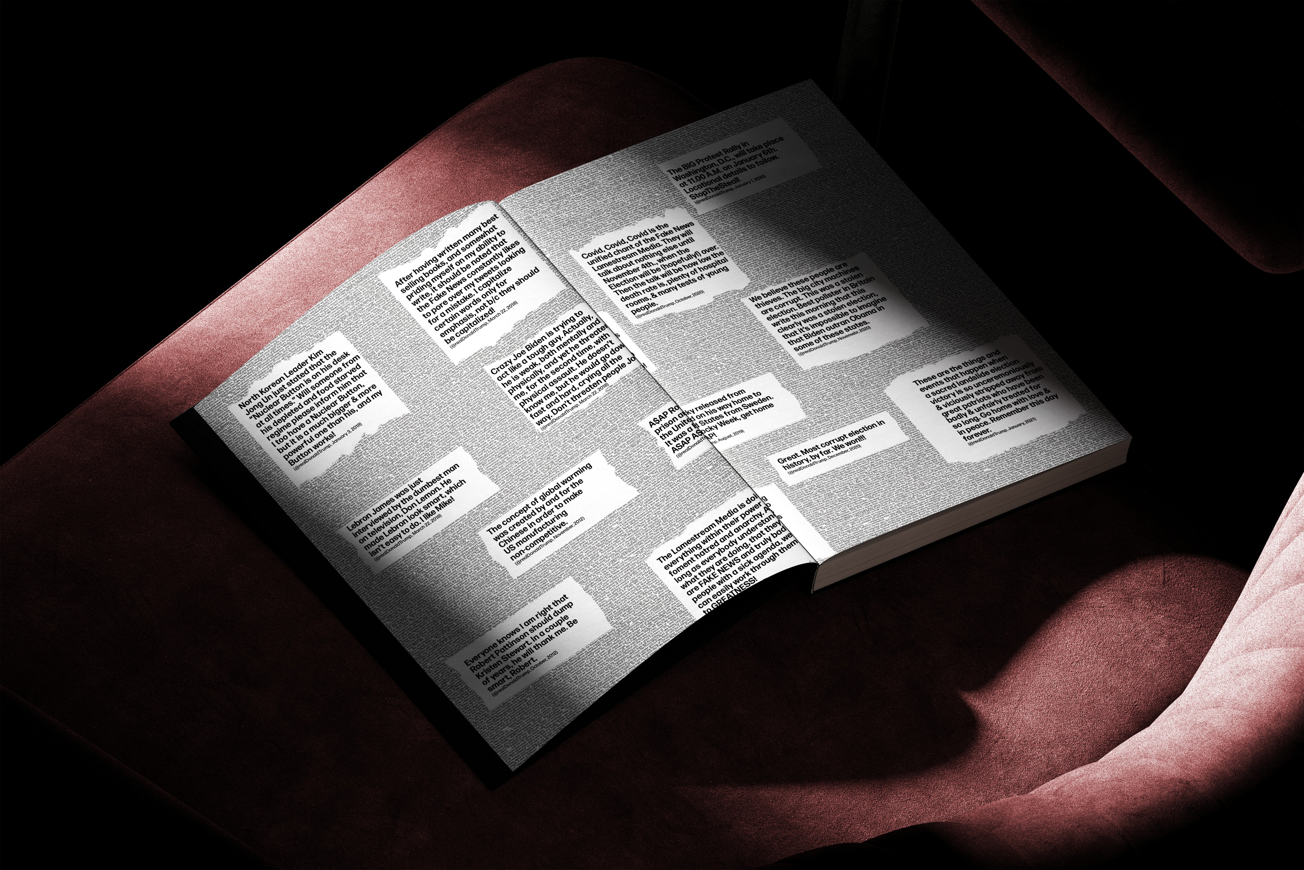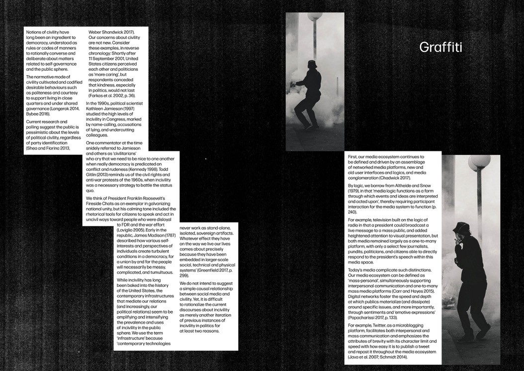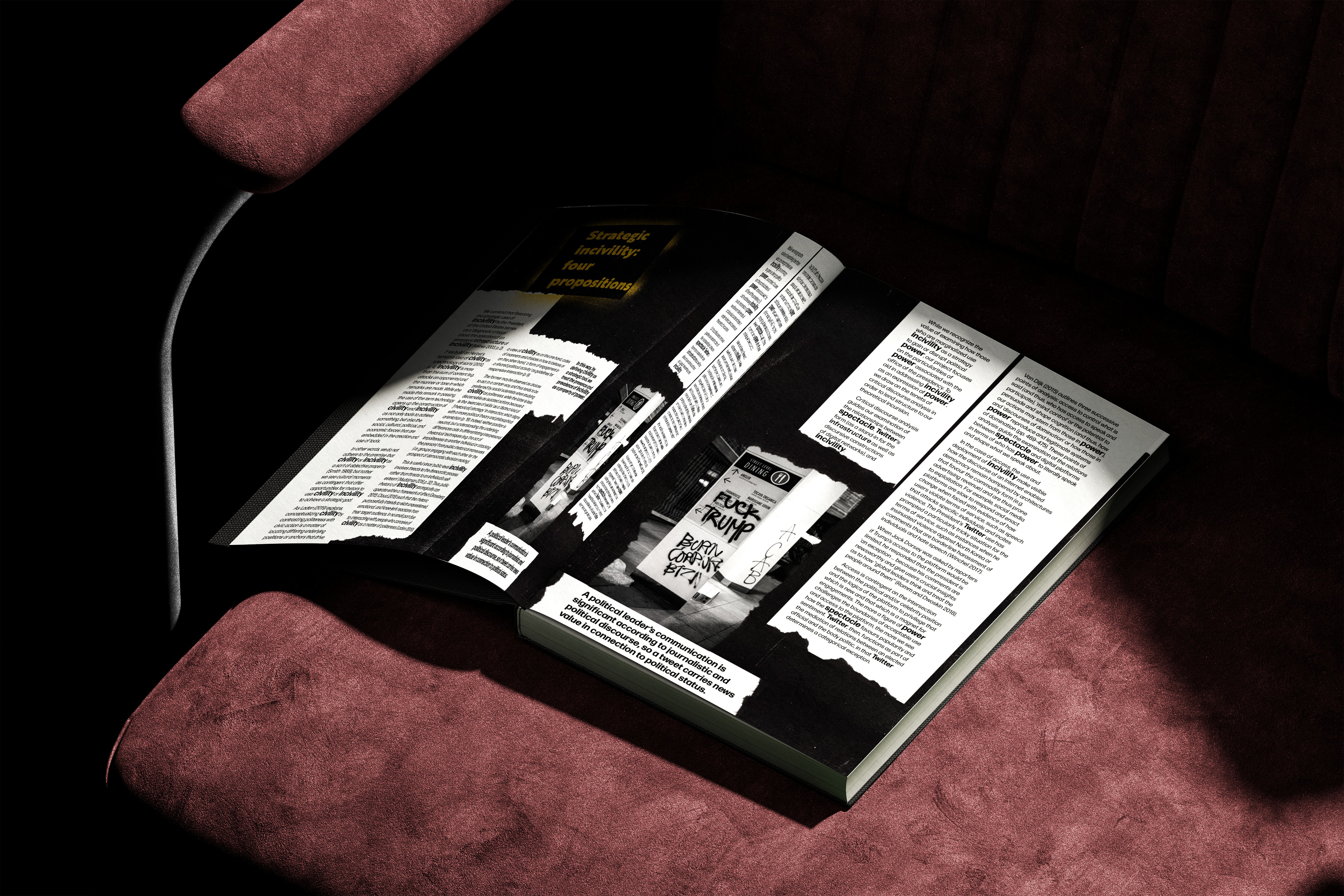 Highlighting incivility and unrest in the reader through a visual narrative of typography and imagery, including popularised tweets from the president during his first tenure, focusing on the use of “FAKE NEWS” and on the uncivil language.